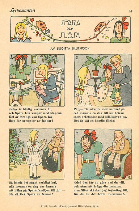 På sista sidan av julnumret krigsvintern 1939 kan vi läsa om hur flickorna Spara och Slösa med blandat resultat ordnar med julklappar till familjen. Spara lyckas i vanlig ordning bäst. Hon ”knåpar ihop” en näsduk (med namnet på) till Pappa och såväl en duk till brickan som en ”arbetspåse med stjälkstygn” till Mamma. Spara belönas med en femkrona av mormor men, Slösa, ska vi förstå, har förbrukat förtroendet: ”Slösa skänker jag ingenting till för då är det borta me´samma.”